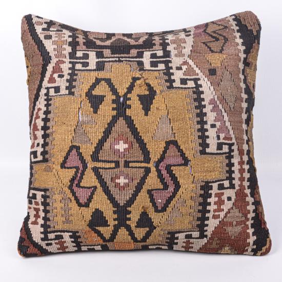 Kırlent Boyutu: 50cm x 50cm Sadece kırlent kılıfı gönderilmektedir. Kuru temizleme önerilir. Ürünün ön yüzü türüne göre; el dokuması yün, pamuk veya halı, arka yüzü fermuarlı pamuk kumaştır. Ürünlerimizde kullanılan kilimlerin en yenisi 50 sene önce dokunmuştur.Kilim; yüzyıllar boyunca Anadolu’ da dokunarak günümüze dek ulaşan ve yozlaşmayan bir kültür haline gelmiştir. 1970’ lerin sonuna kadar kırsalda yaşayan ailelerin her birinin evinde halı ve kilim tezgahları bulunurken 1980’ lerin başından itibaren el dokuması kilim kırlentlerin yerini, polyester iplikler kullanılarak makinede dokunan kumaşlar almıştır. Makineleşmenin artmasıyla son 20 yıldır bu kültür, ne yazık ki unutulmaya yüz tutmuştur. Büyük çoğunluğu Anadolu’ nun farklı yörelerinden toplanan bu eski ve özel motifli el dokuması kilimleri yıkadıktan sonra sağlam olan kısımlarını yastık ve kırlent yüzü veya döşeme olarak kullanıyoruz. Böylece hem kültürel mirasımıza sahip çıkıyor, hem de geri dönüşüme katkı sağlıyoruz. Ürünlerimizde sadece Anadolu’ da değil, Orta Asya bölgesinde ve Batı Trakya’ da dokunmuş kilimler de kullanılmaktadır. Özbekistan, Afganistan, İran, Türkmenistan, Bulgaristan ve Romanya ürünlerimizde kullandığımız kilimlerin dokunduğu yerlere örnek olarak verilebilir. Bazı kilimler pamuk üzerine yün, bazı el dokuması kilimler yün üzerine yün, bazıları ise pamuk üzerine pamuk ipler kullanılarak dokunup kullanıma hazır hale gelmiştir. Günümüzde artık tezgahlarda kilim dokunmamaktadır. Kültürün kaybolmaması için bazı sivil toplum kuruluşları, belediyeler ve özel müzeler haricinde elde kilim dokuması yapılmamaktadır. Kilimlerin üzerindeki model ve motiflerin her biri; dokumayı yapan kişinin ruh halini ve dönemin sosyokültürel yapısını yansıtmaktadır. İpler; koyun yünü, keçi kılı ve pamuğun eğrilmesi ile üretilmiştir. İplerin boyanması için 1950’ den önceki yıllarda kök boya kullanılırken 1950 ve sonrasında, 1970’ lere kadar ot boyaları; daha sonraki dönemlerde ise yarı kimyasal boyalar kullanılmıştır. Tamamı el emeği göz nuru kilimler; genelde duvar süsü veya yer sergisi olarak kullanılmak üzere dokunmuş ve daha sonrasında yine el işçiliğiyle kırlent haline getirilmiştir. Ürünlerimizde kullanılan kilimlerin tamamı; 1940-1960 yılları arasında bitkisel boyalar ve hayvansal iplikler kullanılarak elde dokunmuş, dönemine ait kilimlerdir.